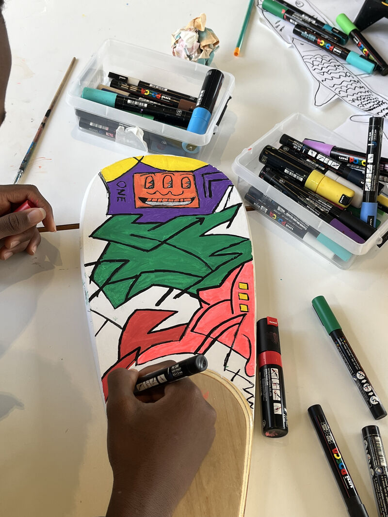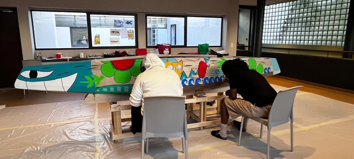 Le canoë fabriqué par les élèves de l'École Être Paris a été transporté à la Cité Refuge pour être décoré par les enfants et adolescent·es résident.e.s, accompagné·es par les travailleur·ses sociaux·ales.